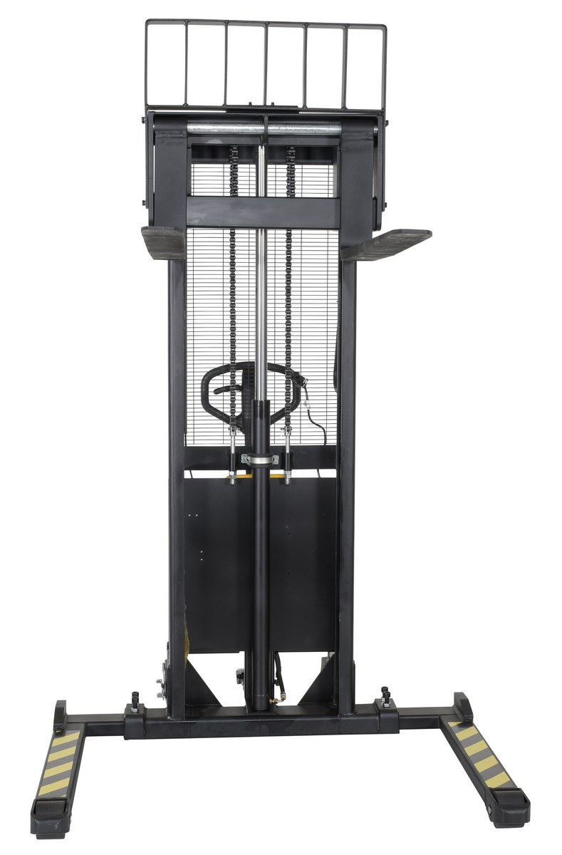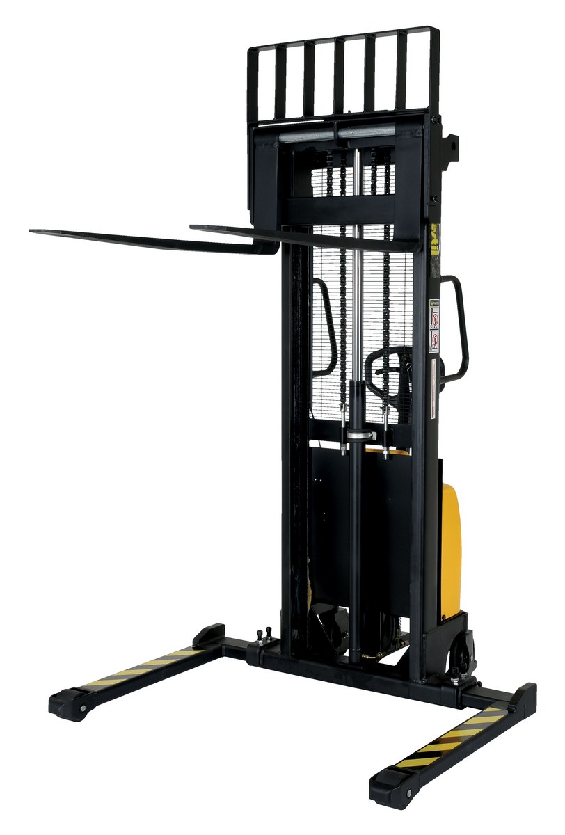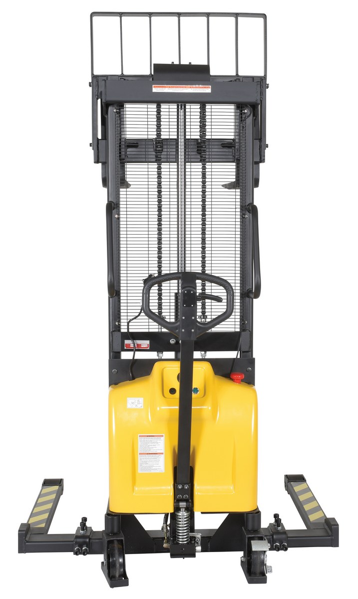 Steel/Plastic Hand Pump DC Powered Stacker with Adjustable Forks and Legs 63 In. Raised Height 2,000 Lb. Capacity Black / YellowAn economical alternative DC powered lift stacker. Ideal for maintenance and commercial applications. This unit can be used as manual hand pump lift or electric powered lift. Ideal when power is not available. High quality hydraulic pump and DC lift system. Compact design and strong steel construction. An economical lift to handle tasks such as transporting dies, molds, and skids. Powered with two (2) 12V AGM batteries. Integral battery charger, battery level gauge, and adjustable lowering speed. All models are easily maneuverable using the standard pull handle. Forks measures 26." wide by 42" long. Individual forks are 6" wide.