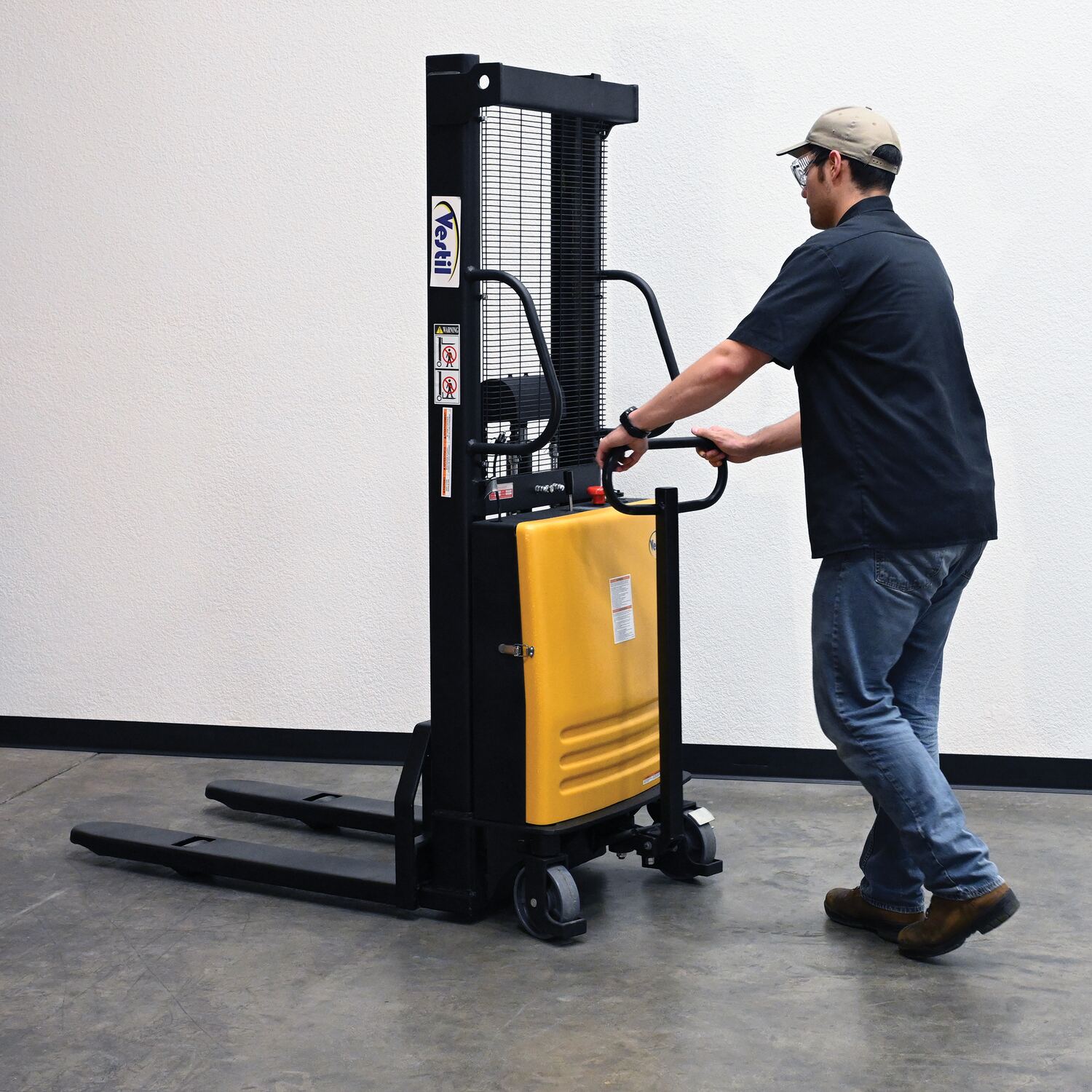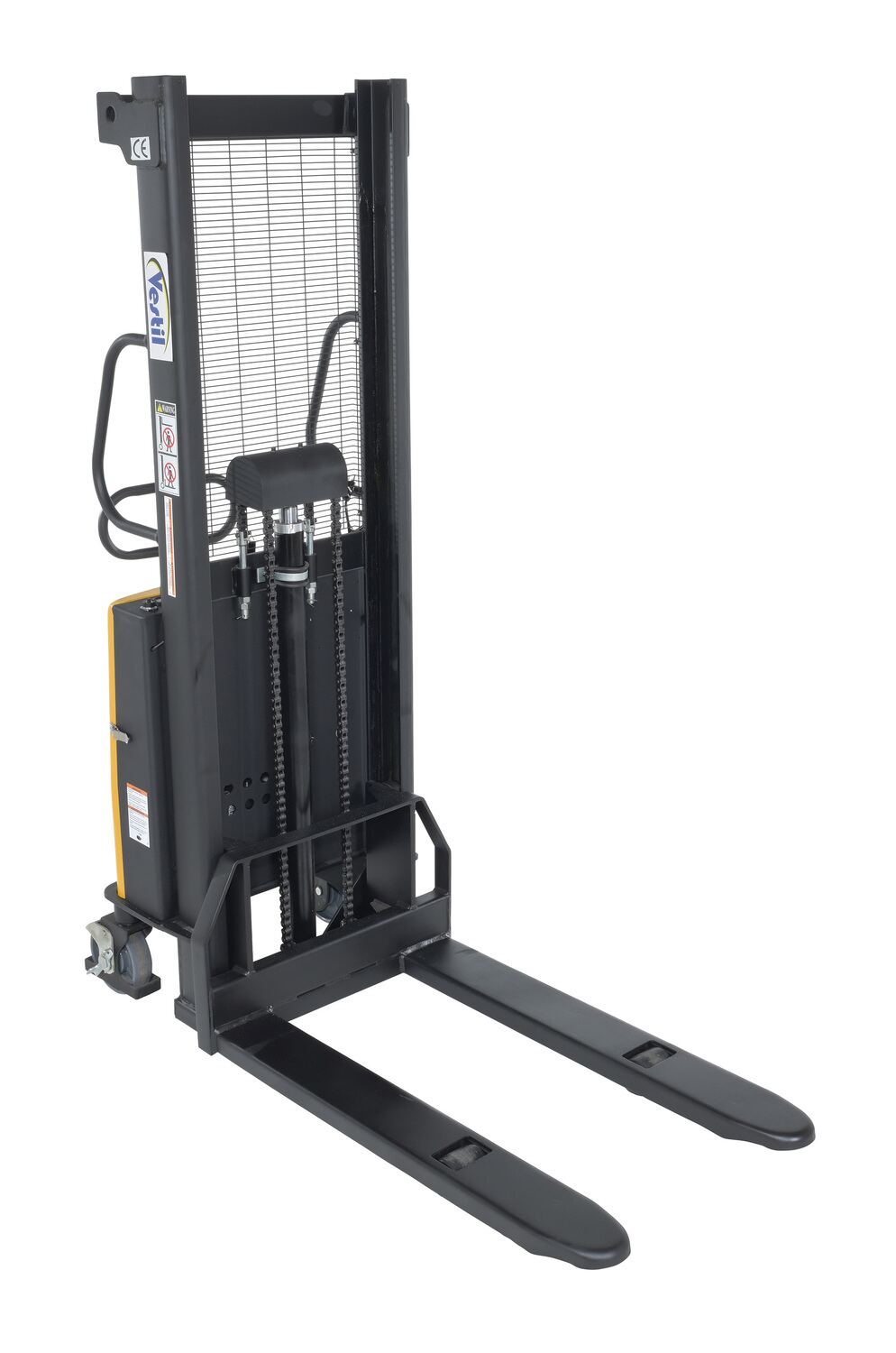 Steel Fixed Stacker with Powered Lift 63 In. Raised Height 2,000 Lb. Capacity Yellow
