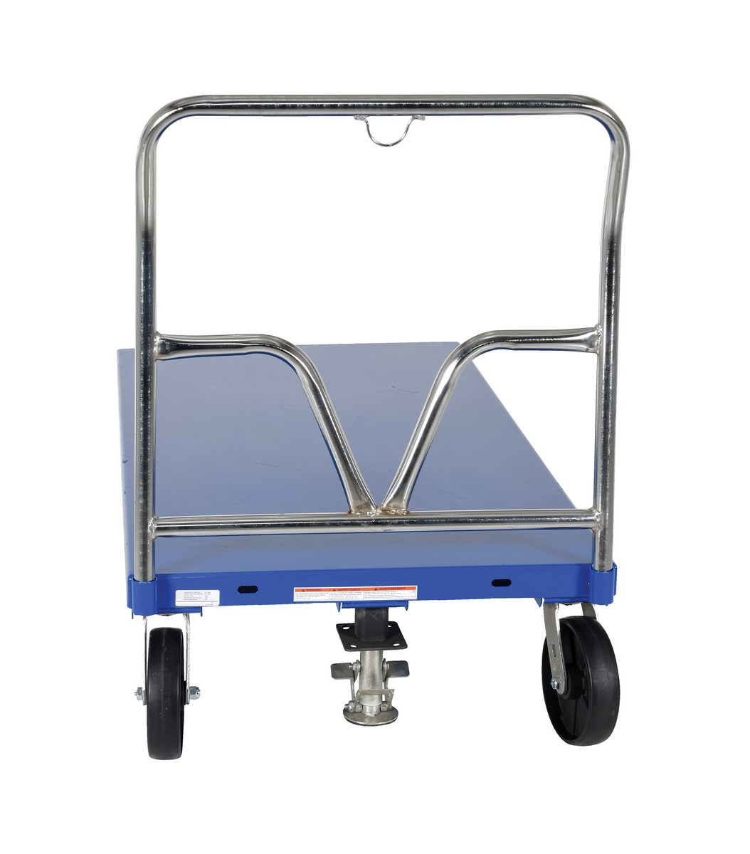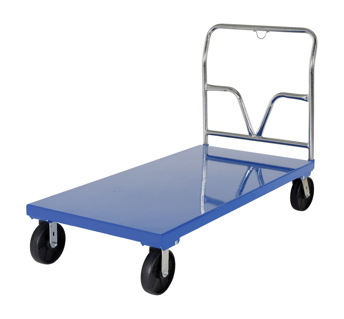 Steel Platform Truck 65-1/2 In. x 30 In. x 40 In. 3,600 Lb. Capacity BlueThis steel Platform Truck with solid, smooth steel deck is all welded and features structural reinforcement underneath for extra strength. Includes one (1) removable high-polished steel handle and rolls smoothly on two rigid and two swivel casters. Comes standard with a floor lock and a durable blue powder coat finish.