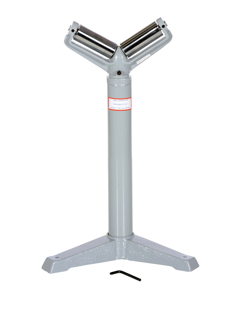 The deluxe roller stand is designed for use as an extra hand when working with long materials. Each stand includes chrome plated rollers and heavy-duty cast-steel base. This roller stand is a v-groove roller design. The height of each stand is adjusted with a friction lock screw or a gas charged cylinder. The unit is great for use in machine and wood shops.