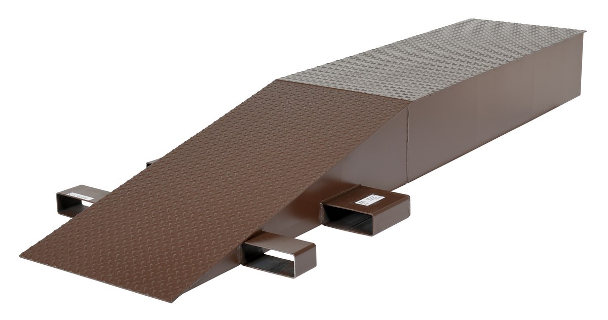 Steel Wheel Riser 108 In. x 24 In. x 12-1/4 In. 40,000 Lb. Capacity BrownWheel risers are designed to raise trailers to an appropriate crossover height for loaded fork trucks. Made of heavy-duty welded steel construction, these wheel risers are built to last! Each riser is equipped with fork pockets for easy transportation wherever a fork truck is available. Ramps may be stacked for convenient storage when not in use. Wheel risers are sold and priced as individual units.