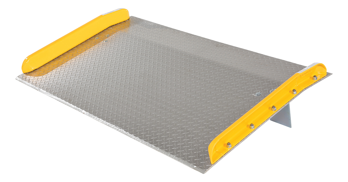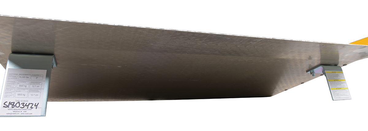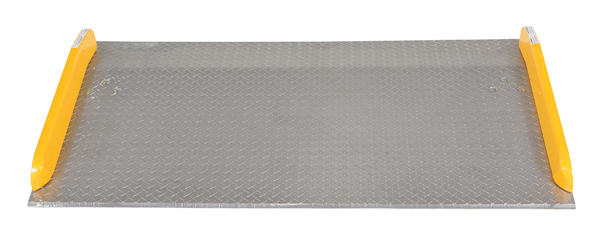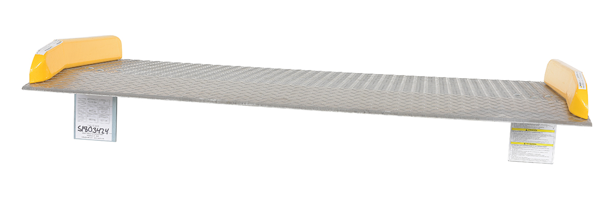The Aluminum truck dock board with steel safety curbs is designed for portability and safety. The deck is made of tough high strength aluminum tread plate. The edges are beveled for smooth entry and exit. Safety curbs are coated yellow and are constructed of steel with cast tapered ends. Steel legs are bolted on for increased durability. Canted locking legs for easier truck portability. Manufactured in compliance with OSHA. The capacity is based upon the heaviest type of equipment used plus the maximum load carried times the single axle rating of total load. Dynamic loading, driver tendencies, speed and frequency of use must be considered. When using three-wheeled fork trucks order dock board with capacity at least four-times the lifting capacity of fork truck. The width of the dock board should be at least fifteen (15) inches wider than the load or equipment passing between the curbs. If the load does not pass between curbs, but is elevated above, add fifteen (15) inches to overall width of equipment.