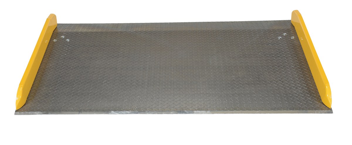 The Aluminum truck dock board with steel safety curbs is designed for portability and safety. The deck is made of tough high strength aluminum tread plate. The edges are beveled for smooth entry and exit. Safety curbs are coated yellow and are constructed of steel with cast tapered ends. Steel legs are bolted on for increased durability. Canted locking legs for easier truck portability. Manufactured in compliance with OSHA. The capacity is based upon the heaviest type of equipment used plus the maximum load carried times the single axle rating of total load. Dynamic loading, driver tendencies, speed and frequency of use must be considered. When using three-wheeled fork trucks order dock board with capacity at least four-times the lifting capacity of fork truck. The width of the dock board should be at least fifteen (15) inches wider than the load or equipment passing between the curbs. If the load does not pass between curbs, but is elevated above, add fifteen (15) inches to overall width of equipment.
