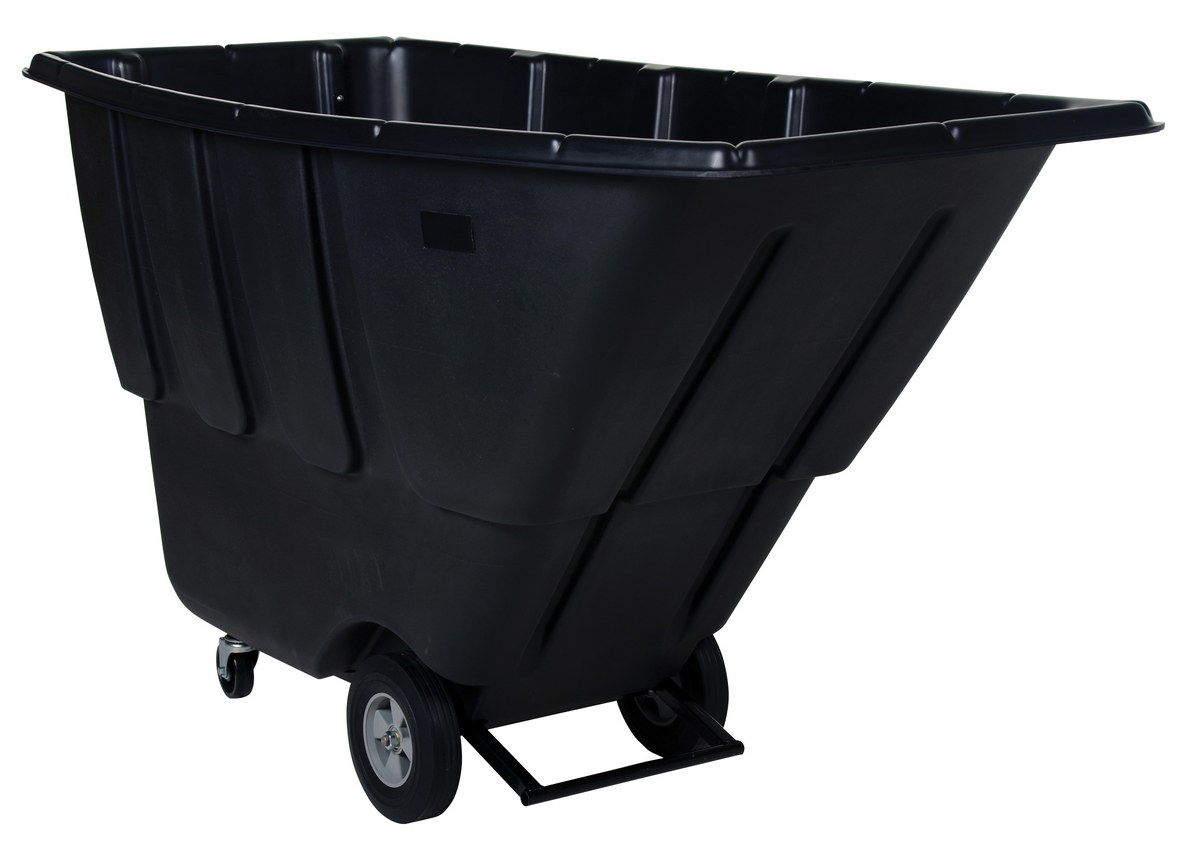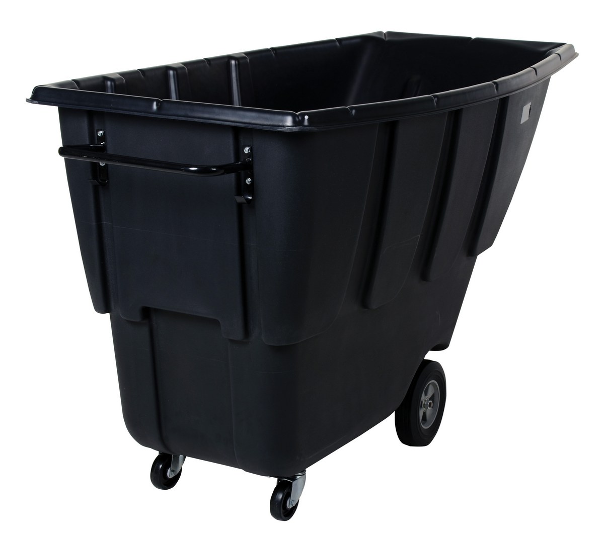 Durable plastic construction allows for collecting waste from multiple bins at a collective time. Great for warehouses, fairs, ball parks, schools, etc. Strong, one-piece molded polyethylene body with steel base tip support and a balanced design to allow for simple dumping by one person. Easily portable on 2 large rubber wheels and two swivel wheels. Not for use with fork trucks. Black color design.