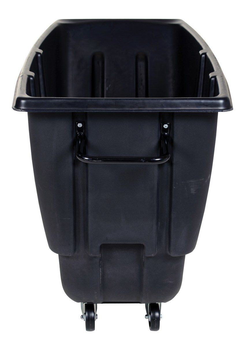 Durable plastic construction allows for collecting waste from multiple bins at a collective time. Great for warehouses, fairs, ball parks, schools, etc. Strong, one-piece molded polyethylene body with steel base tip support and a balanced design to allow for simple dumping by one person. Easily portable on 2 large rubber wheels and two swivel wheels. Not for use with fork trucks. Black color design.