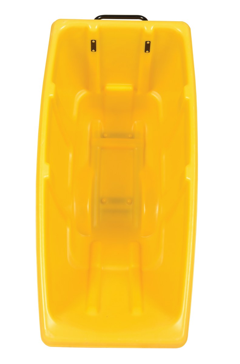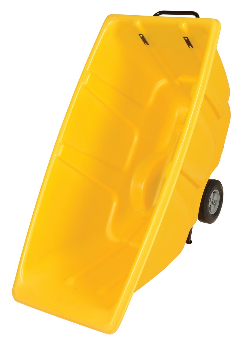 Durable plastic construction allows for collecting waste from multiple bins at a collective time. Great for warehouses, fairs, ball parks, schools, etc. Strong, one-piece molded polyethylene body with steel base tip support and a balanced design to allow for simple dumping by one person. Easily portable on 2 large rubber wheels and two swivel wheels. Not for use with fork trucks. Yellow color design.