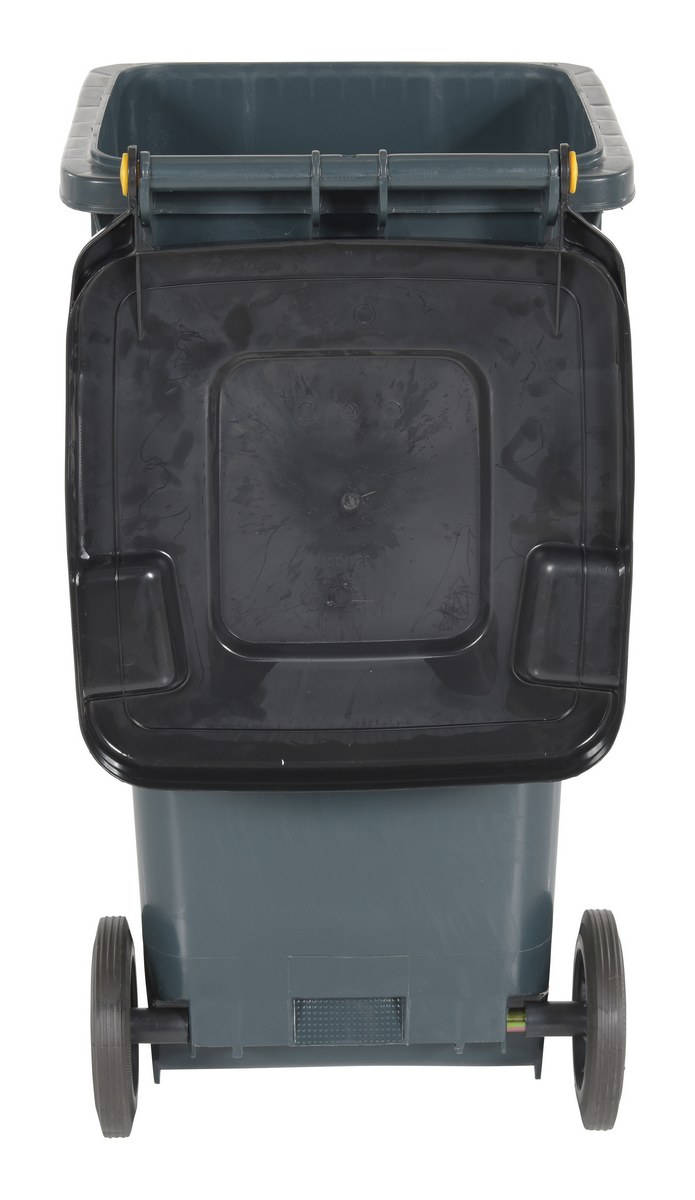 The trash can is constructed of durable polyethylene that withstands subzero cold and extreme summer heat. Great for high traffic areas such as: warehouses, fairs, ball parks, schools, etc. Each container includes two (2) wheels for easy portability and hinged lips to keep the rain out. Keep your waste out of eyesight in our heavy-duty and easy to move refuse containers.