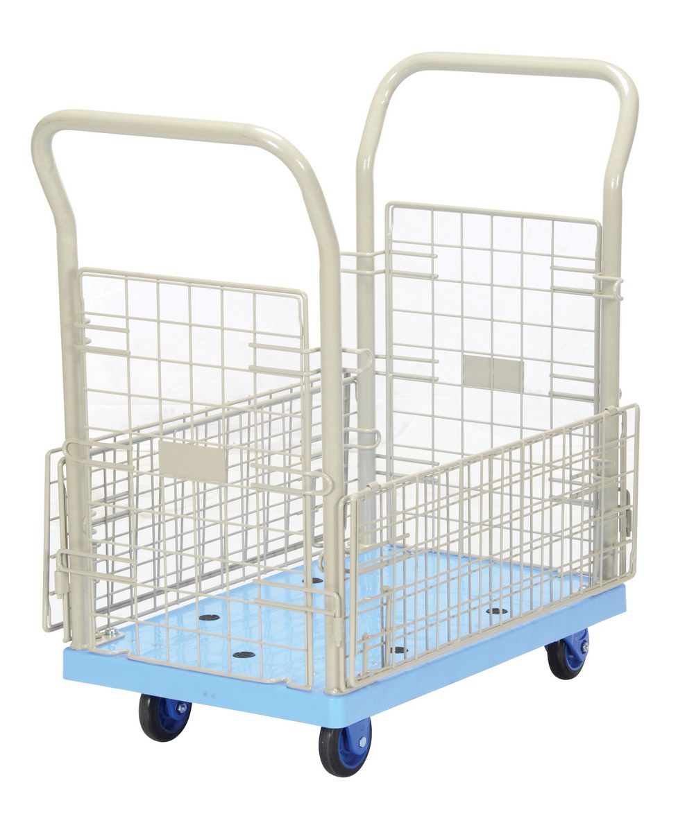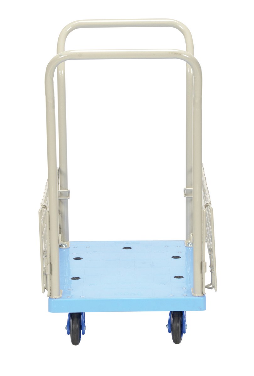Plastic Truck Mesh Sides 32-1/2 In. x 19-1/4 In. x 34 In. 330 Lb. Capacity BlueThe plastic platform cart is a great addition to the shipping and distributing facilities. The plastic platform creates a durable, yet lightweight construction that can be transferred simply from workstation to workstation. The unit rolls on casters for smooth transference over a variety of terrains, while the side nets enable the utmost security. The attached handle creates a more ergonomic posture of personnel during use.