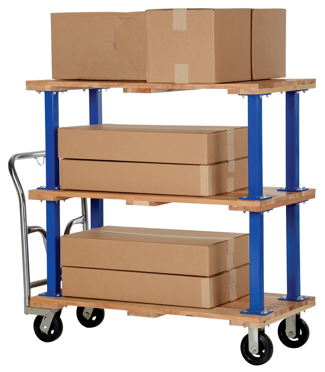 Minimize lifting and bending with this triple decker Hardwood platform cart/portable work bench. Ideal for shipping areas, offices, and plant use, this economical cart is perfect for many of your applications. Countersunk holes allow for a smooth deck surface.