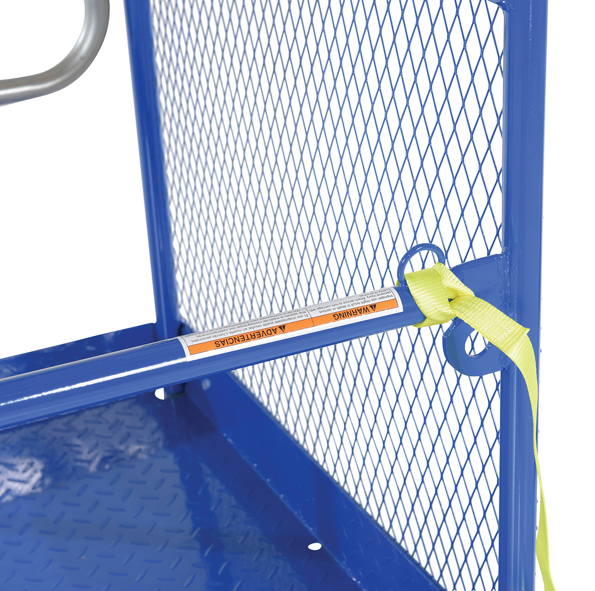 This convenient fork truck work platform quickly and safely raises maintenance personnel where they are needed. Attaches to fork truck by inserting forks into fork pockets and securing platform to fork truck. Fork locks secure platform to forks. Dual handrails on three (3) sides with expanded metal backing on the fourth side. Includes checker floor plate platform and long strap with hook to attach platform to fork truck. A maximum of two (2) people can be in the work platform at one time.