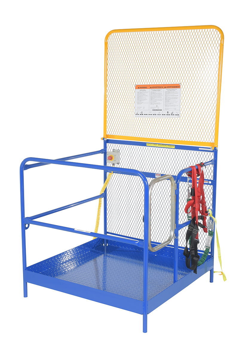 Steel Full Featured Work Platform With 84 In. Expanded Back 48 In. x 48 In. 1,000 Lb. Capacity BlueThis convenient fork truck work platform quickly and safely raises maintenance personnel where they are needed. Attaches to fork truck by inserting forks into fork pockets and securing platform to fork truck. Fork locks secure platform to forks. Dual handrails on three (3) sides with expanded metal backing on the fourth side. Includes checker floor plate platform and long strap with hook to attach platform to fork truck. A maximum of two (2) people can be in the work platform at one time. The full featured units include an emergency stop button kit and web lanyard with XL safety harness. Alternate size harnesses available upon request, S-XL (XXL & XXXL available at an additional charge). Meets California OSHA specifications.