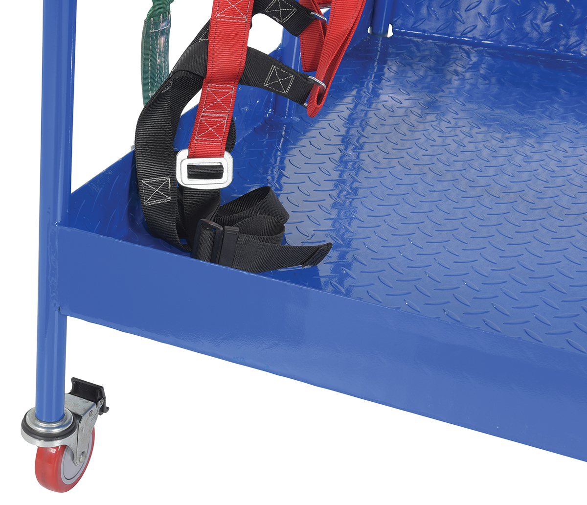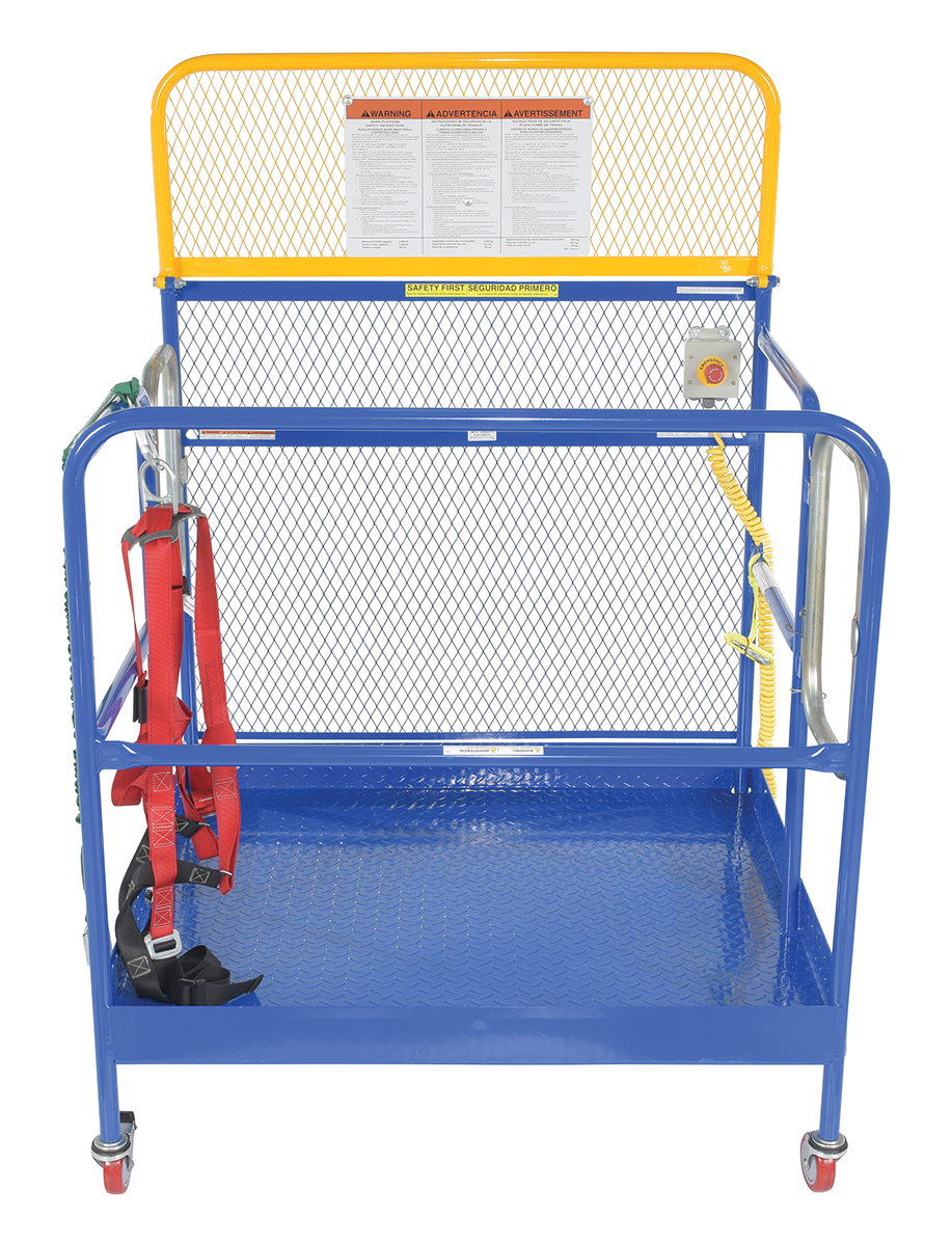Steel Full Featured Work Platform With Poly Casters and 2 Door Entry 48 In. x 48 In. 1,000 Lb. Capacity BlueThis convenient fork truck work platform quickly and safely raises maintenance personnel where they are needed. Attaches to fork truck by inserting forks into fork pockets and securing platform to fork truck. Fork locks secure platform to forks. Expanded metal backing on fourth side. Includes checker floor plate platform and long strap with hook to attach platform to fork truck. A maximum of two (2) people can be in the work platform at one time. The full featured units include an emergency stop button kit and web lanyard with XL safety harness. Alternate size harnesses available upon request, S-XL (XXL & XXXL available at an additional charge).